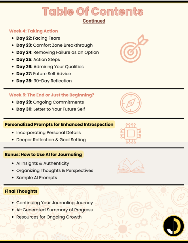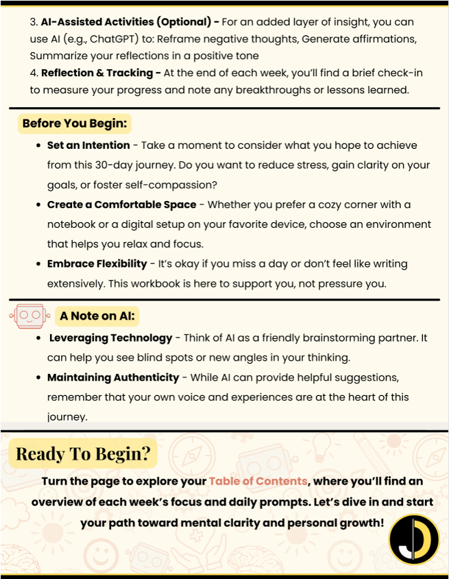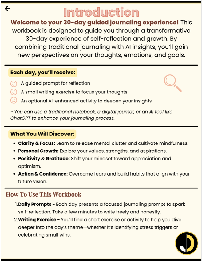 This structured 30-day workbook provides guided prompts, thought-provoking exercises, and AI-enhanced journaling techniques to help you: