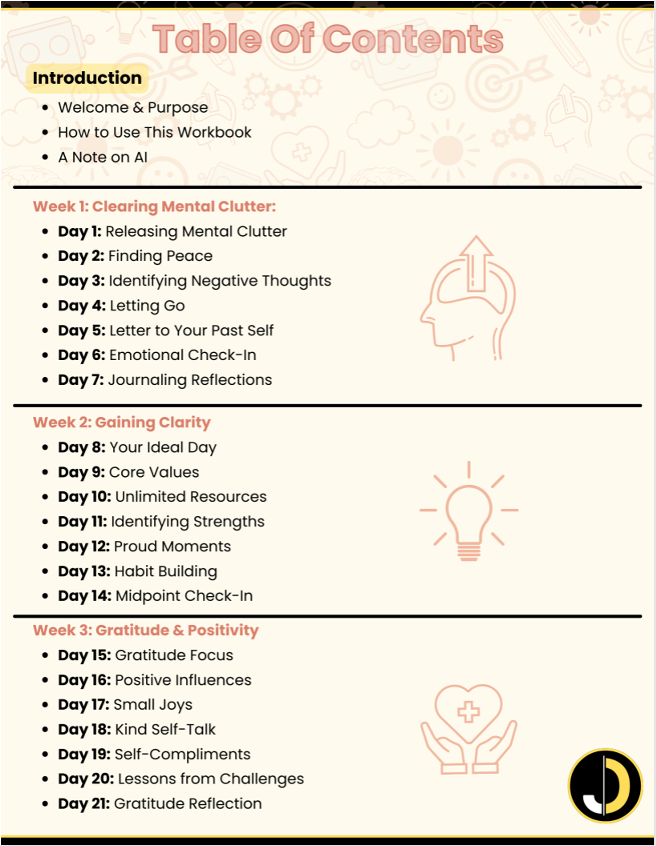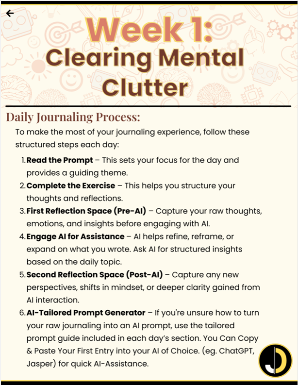 Unlock a clearer mind and a more focused life with 30 Days to Mental Clarity, an interactive AI-powered journaling experience designed to help you reflect, declutter your thoughts, and gain deeper self-awareness.