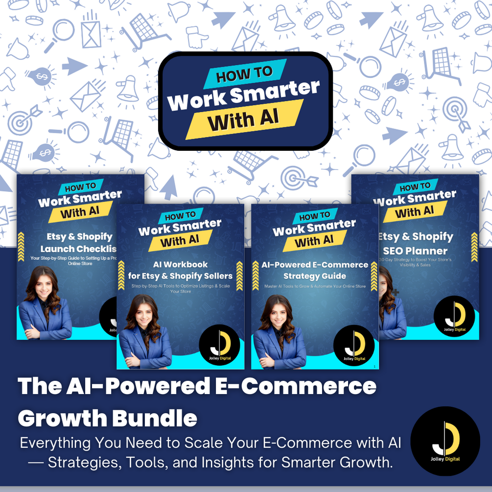 AI-Powered E-Commerce Growth Bundle Unlock your e-commerce success with this all-in-one bundle designed for Etsy & Shopify sellers. Boost productivity and increase sales with tools like: AI Strategy Guide: Step-by-step roadmap for success AI Workbook: Supercharge store performance Launch Checklist: Avoid common mistakes SEO Planner: Drive more traffic and sales Ready to grow smarter and faster? This bundle gives you everything you need to thrive in the digital world!